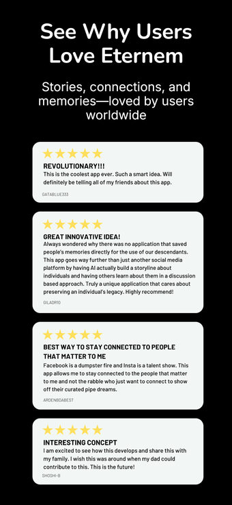 แอปนี้มีฟีเจอร์ Persona ที่ขับเคลื่อนด้วย AI ซึ่งพัฒนาขึ้นตามข้อมูลที่ผู้ใช้ป้อน ทำให้คนรุ่นถัดไปสามารถมีปฏิสัมพันธ์กับแก่นแท้ของผู้เขียนต้นฉบับ ผู้ใช้สามารถเชื่อมโยงความทรงจำกับเหตุการณ์หรือสถานที่เฉพาะ ซึ่งช่วยเสริมประสบการณ์การเล่าเรื่องและสร้างไดอารี่มัลติมีเดียที่มีความหลากหลายด้วยภาพถ่าย วิดีโอ และการบันทึกเสียง Eternem เน้นความเป็นส่วนตัวและการควบคุม โดยให้ผู้ใช้ตัดสินใจเกี่ยวกับการมองเห็นของการบันทึกของพวกเขาในขณะที่ส่งเสริมการเชื่อมต่อข้ามรุ่น